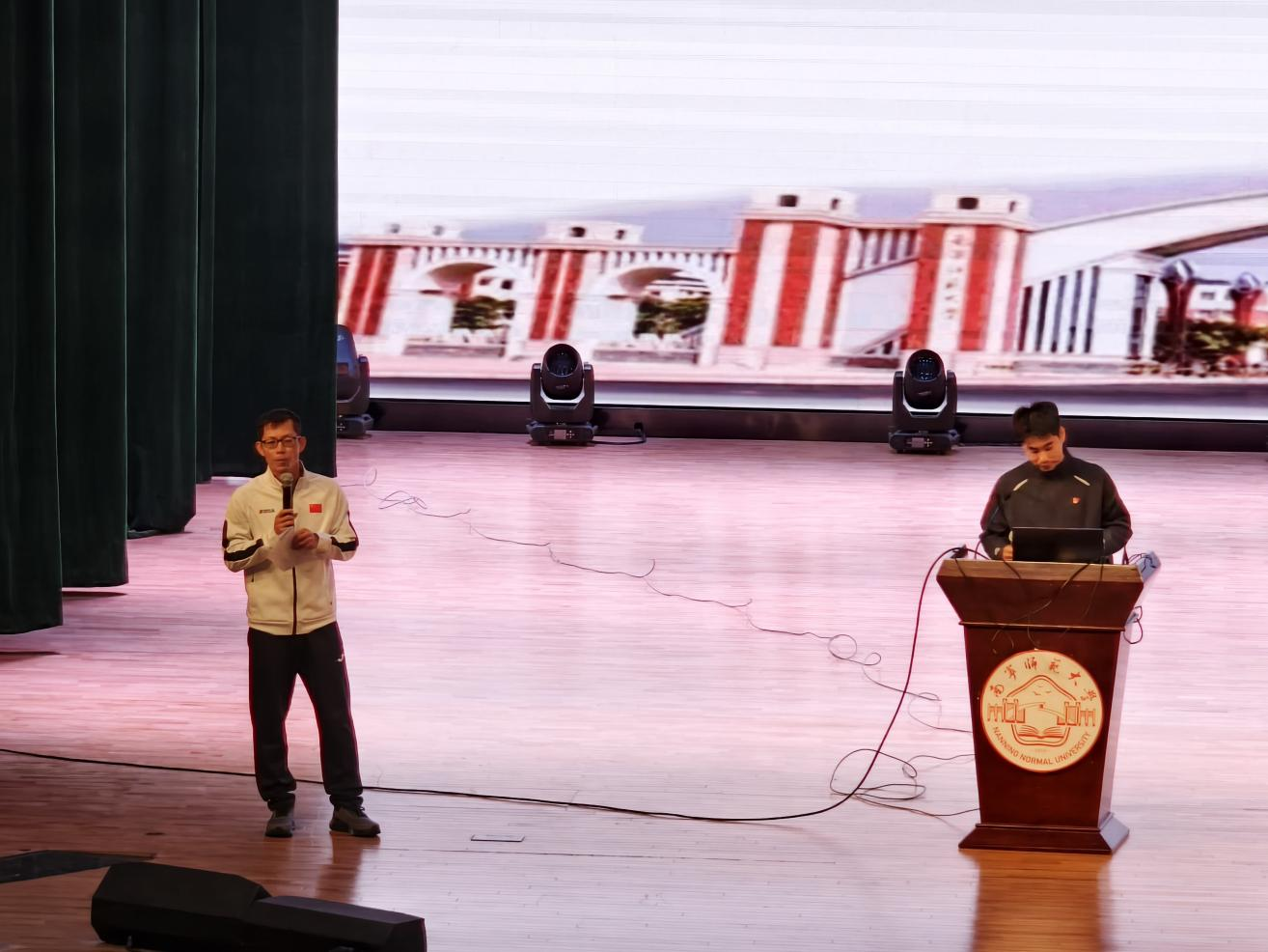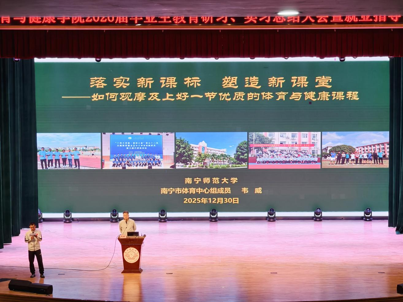 武鸣中学韦威老师以《落实新课标、塑造新课堂——如何观摩与上好一节优质体育与健康课》为题,围绕教学实践与育人方法展开分享,为在座学生提供了切实可行的教学指导。讲座结束后,学生们围绕教学实践难点与职业发展等问题积极提问,与会嘉宾结合自身经验逐一耐心解答,现场互动热烈。