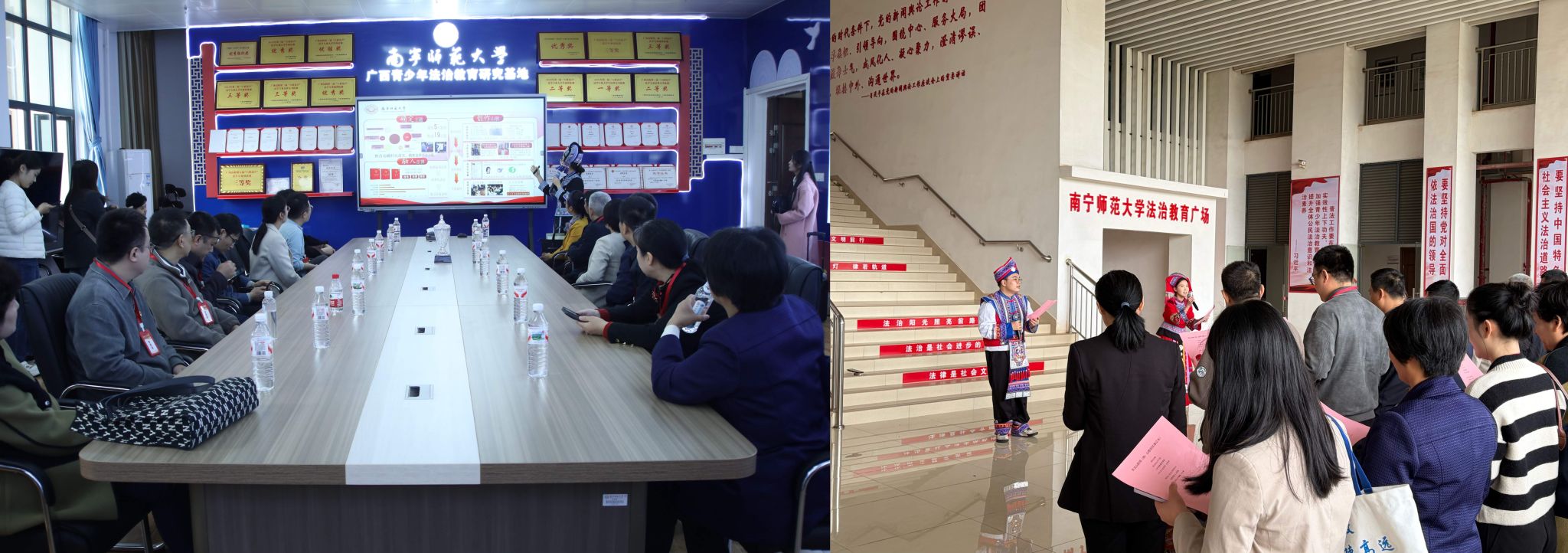 随后,广西开放大学(广西信息职业技术学院)交流团分组实地参观了我校经济与管理学院党建文化走廊、初等教育学院明德史馆、生命之美标本馆、非遗工作室和广西青少年法治教育基地,并在基地前合影留念。