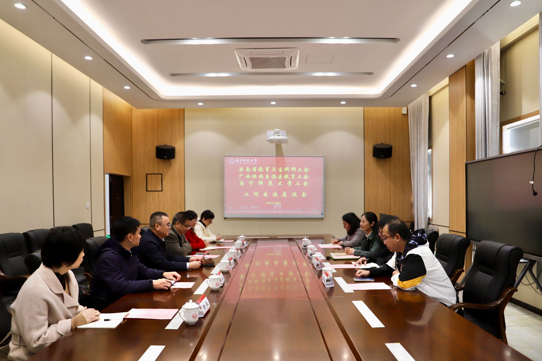 会上,南宁师范大学工会常务副主席陈名贤对云南师范大学同仁的到访表示热烈欢迎,并介绍了学校发展概况。王丽萍对此行的周到安排表示感谢,并简要介绍了云南师范大学的总体情况。