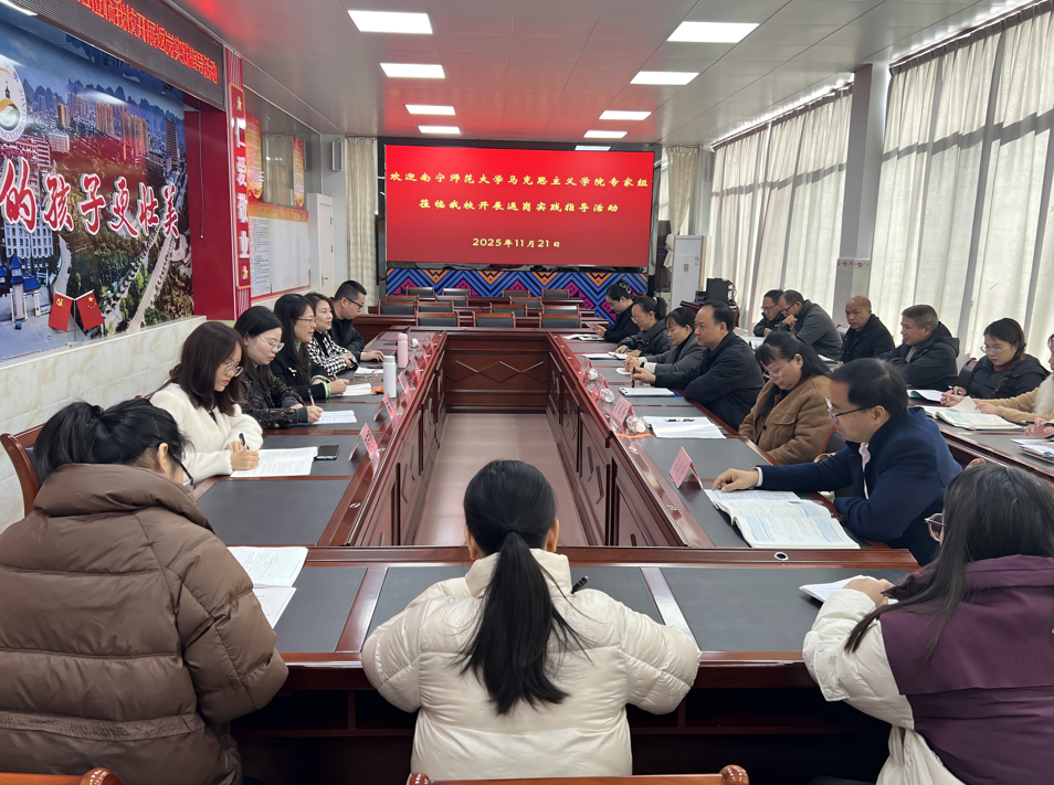 活动期间,教研室教师与那坡县高级中学、靖西中学、防城港市防城中学、龙州县高级中学等学校领导及思政课教师举行座谈,围绕“大中小学思政课一体化建设”“铸牢中华民族共同体意识教育”等议题展开深入交流,共同探讨如何将边境地域特色转化为育人的独特优势,进一步提升边境学校思政课教学的实效性与吸引力。