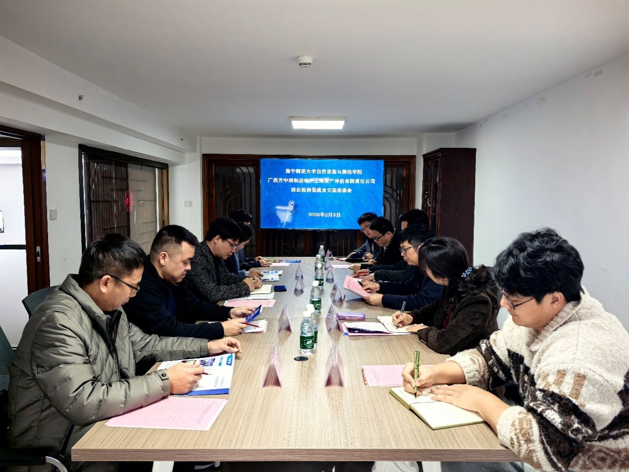 为拓宽毕业生就业渠道,深化产教融合与校企合作,2月3日下午,自然资源与测绘学院院长陆汝成教授带队一行6人赴广西方中利和房地产土地资产评估有限责任公司开展访企拓岗走访交流。学院党委副书记全广铭(主持工作)、党委副书记副书记莫雅兰及土地资源管理、测绘工程、房地产开发与管理专业相关老师一同参与调研。我校校友、广西方中利和房地产土地资产评估有限责任公司总经理苏勋热情接待。