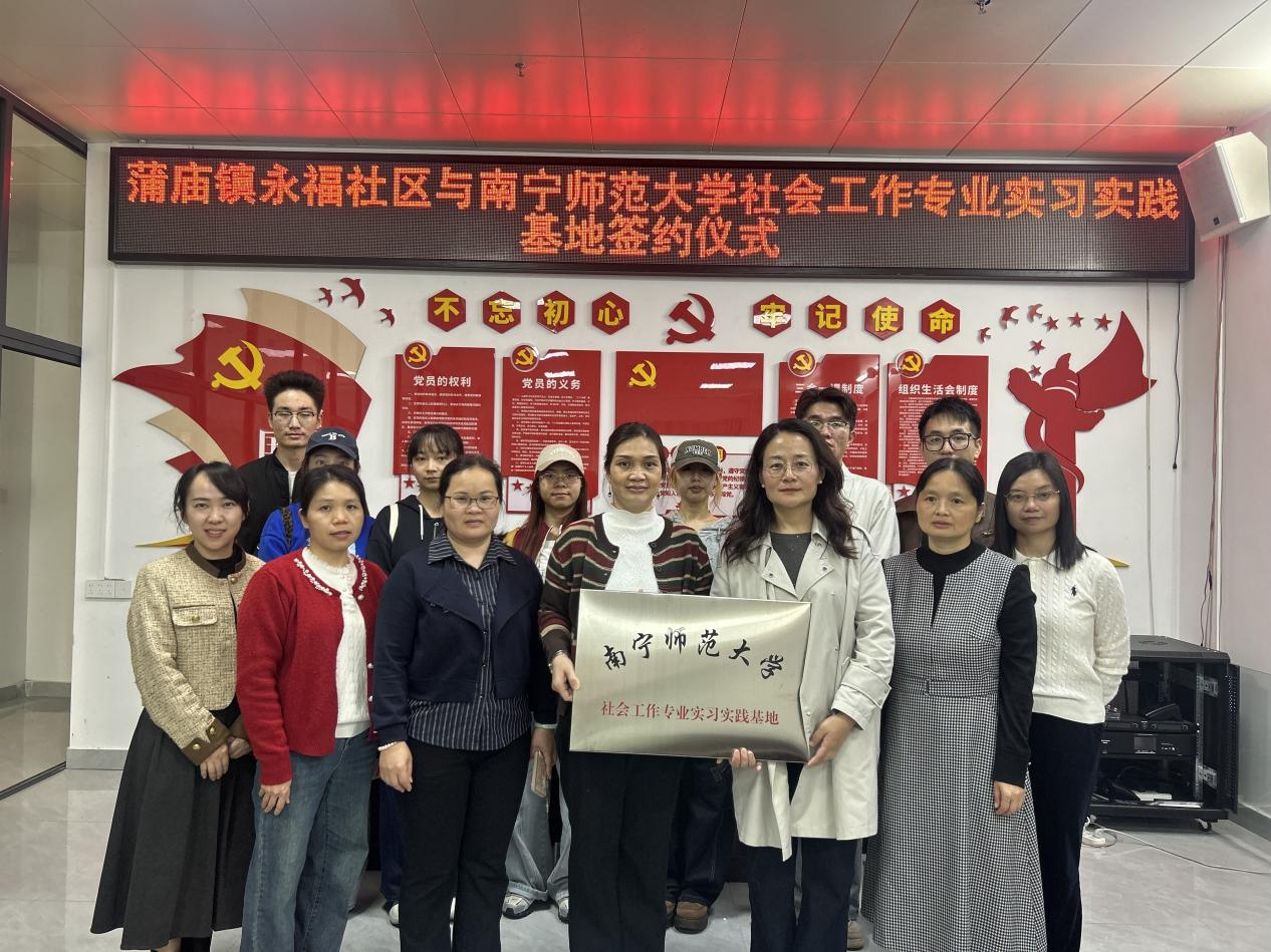 仪式上,双方代表共同签署了合作协议,并为实习基地揭牌。此次共建不仅为南宁师范大学社会工作专业学生提供了优质的实践平台,有助于提升师生专业实务能力,同时也将为永福社区引入专业社工力量,赋能社区治理与服务工作,实现校地资源的优势互补与共建共赢。
