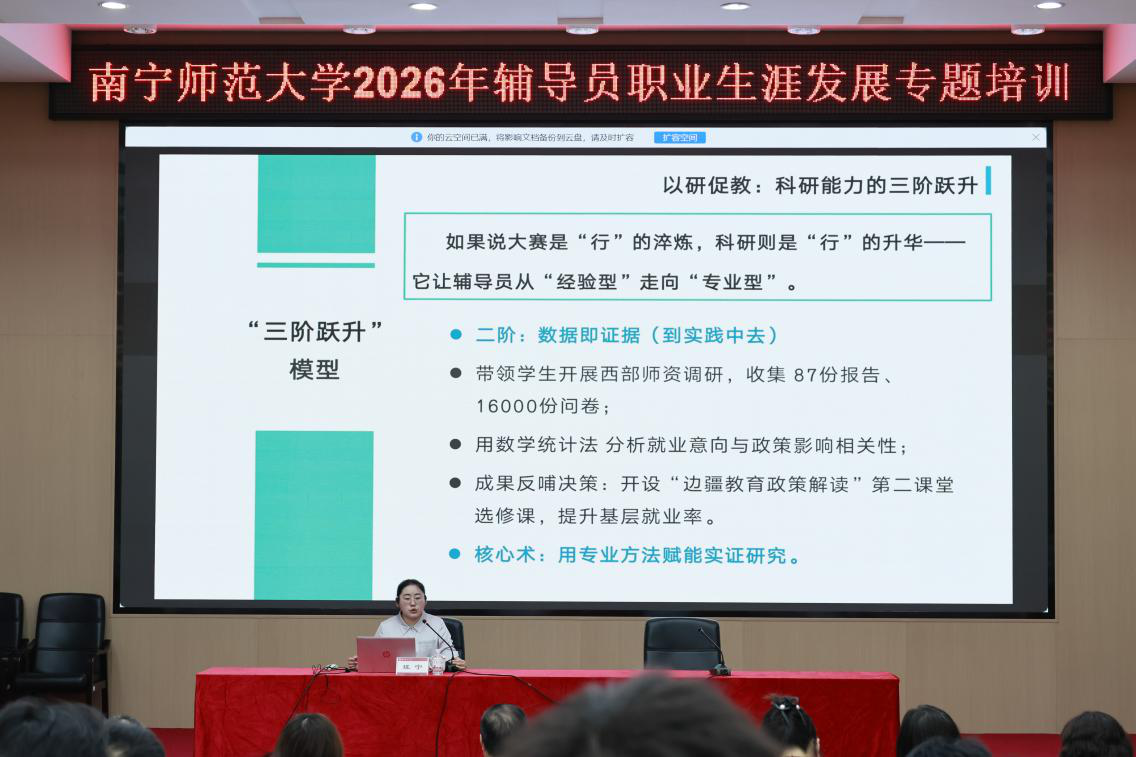 3月20日下午,我校2026年辅导员职业生涯发展专题培训在明秀校区文星楼301报告厅举行。2024年全国高校辅导员素质能力提升骨干训练营“十佳标兵”、广西“最美高校辅导员”班宁老师应邀作专题分享。各学院党委副书记、专职辅导员及兼职辅导员参会,党委学生工作部负责人主持培训。