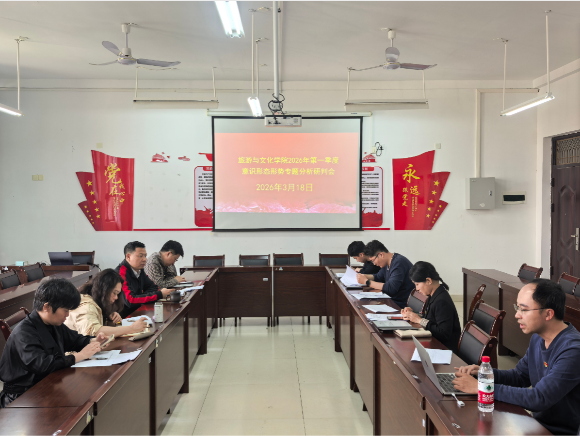 3月18日上午,旅游与文化学院在武鸣校区地信楼B201会议室召开2026年第一季度校园意识形态和安全稳定形势专题分析研判会,传达学校有关文件精神和工作部署要求,分析研判近期学院校园意识形态领域和安全稳定形势,部署第一季度学院校园意识形态和安全稳定工作。学院党委书记贾坷主持会议。
