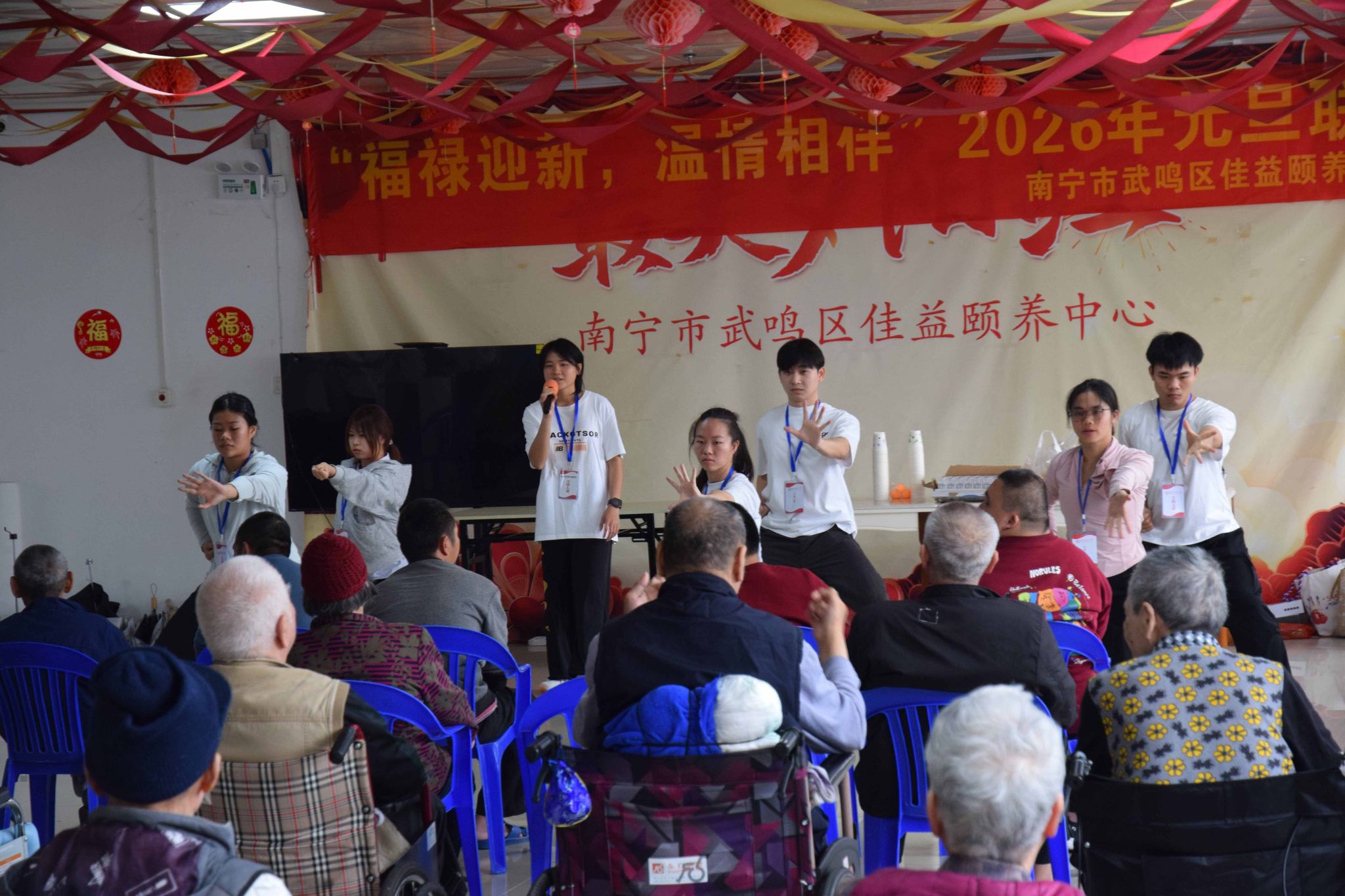 期间,武术协会的同学们带领老人们练习养生保健操,齐唱红色经典歌曲。在轻松温馨的氛围中,大家还一同参与了互动小游戏。轻快的节奏、真挚的笑容,让老人们深切感受到青春的朝气与活力。