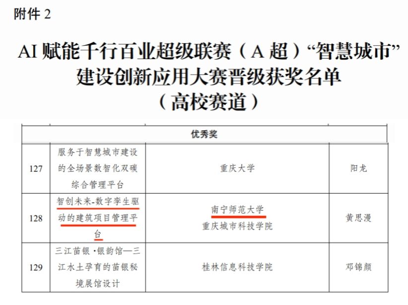3月29日,由我校自然资源与测绘学院牵头,联合重庆城市科技学院,在王永卿老师、王妙灵老师、凌恺老师的悉心指导下,黄思漫等七名同学组成的队伍表现出色,凭借《智创未来-数字孪生驱动的建筑项目管理平台》项目,在AI赋能千行百业超级联赛(A超)“智慧城市”建设创新应用大赛(高校赛道)中荣获优秀奖。