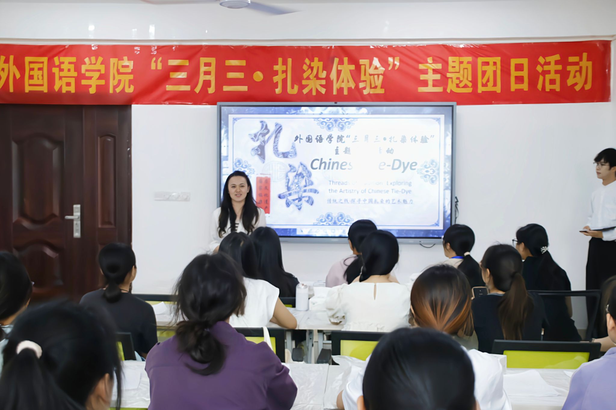 为弘扬中华优秀传统文化,丰富校园文化生活,4月1日下午,外国语学院在实验楼1B-516会议室举办“蓝染匠心,韵染‘三月三’”主题团日活动。此次活动以扎染非遗技艺体验为载体,巧妙融合学院英语专业特色,让学生在动手实践中感受传统技艺的魅力。