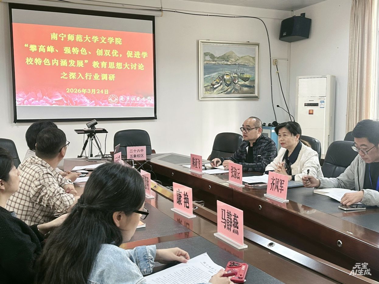 为深入推进“攀高峰、强特色、创双优,促进学校特色内涵发展”教育思想大讨论,进一步加强校际协同育人,推动师范生培养与中学教育实际需求深度融合,3月24日,南宁师范大学文学院党委副书记吴幼坚、副院长张淑云分别带队赴南宁市第八中学和南宁市第二十六中学开展专题调研。南宁市第八中学副校长闫晶晶、南宁市第二十六中学副校长顾慧明及两校的教师代表参与了调研座谈。