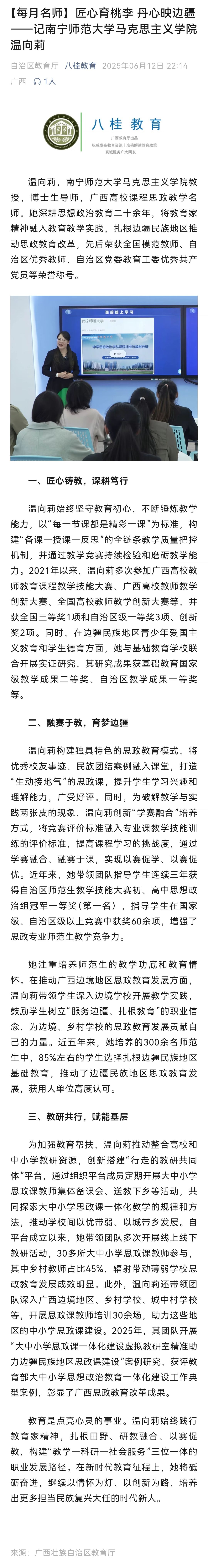 【广西壮族自治区教育厅】【每月名师】匠心育桃李 丹心映边疆——记南宁师范大学马克思主义学院温向莉