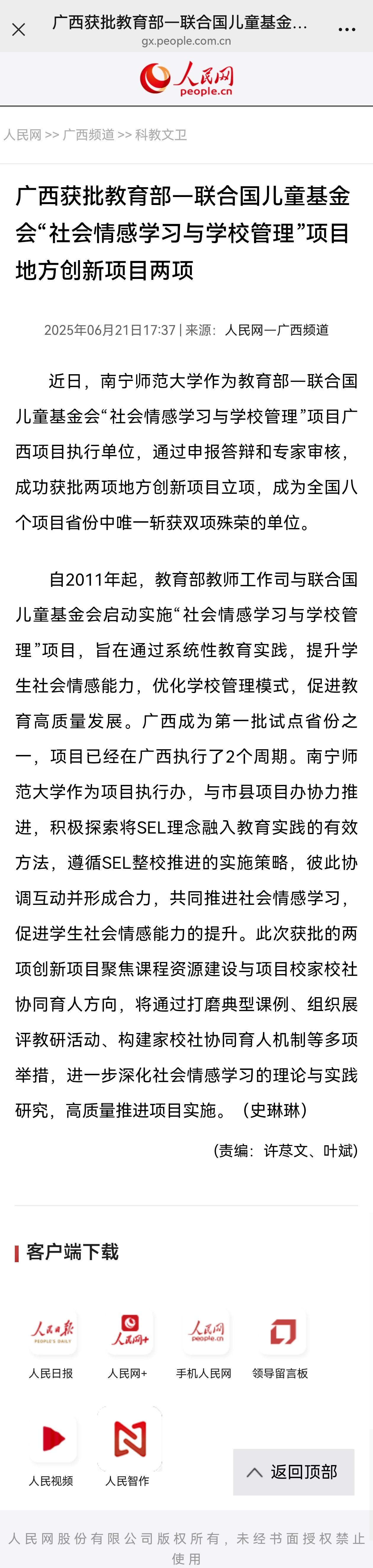 【人民网】广西获批教育部—联合国儿童基金会“社会情感学习与学校管理”项目地方创新项目两项