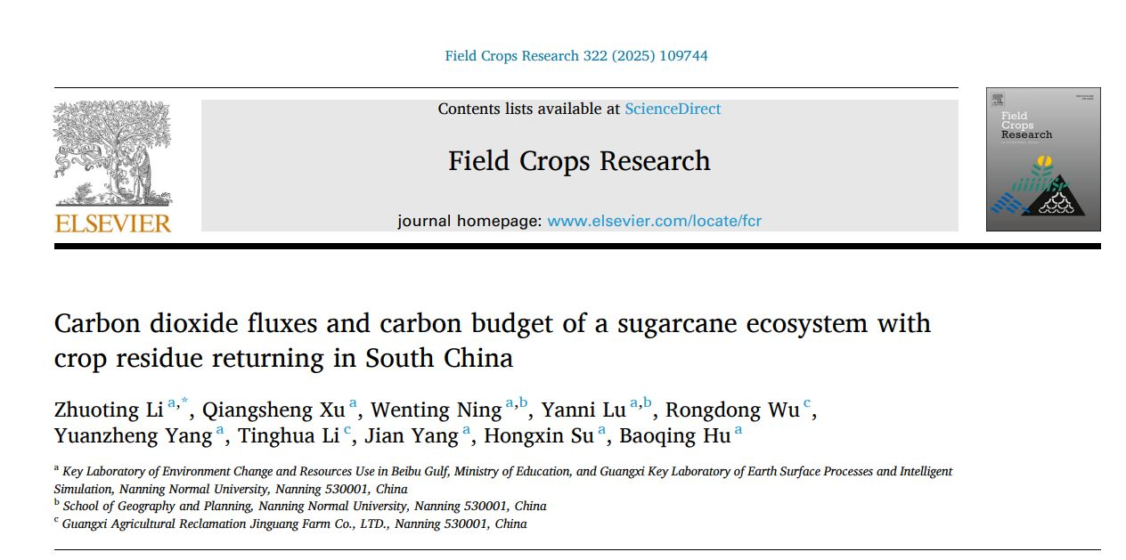 近日,我校地理与海洋研究院李卓亭团队在国际农林科学领域知名经典期刊《Field Crops Research》(中科院SCI一区Top期刊)发表了关于我国甘蔗生态系统碳通量及碳源/汇特征(Carbon dioxide fluxes and carbon budget ofa sugarcaneecosystem with straw returninginSouth China)的最新研究论文。李卓亭副研究员为第一作者及通讯作者,南宁师范大学北部湾环境演变与资源利用教育部重点实验室为第一完成单位。合作作者包括:地理与海洋研究院科研人员徐强胜、杨元征、杨健、苏宏新和胡宝清;在读硕士研究生宁文婷和陆艳妮,以及广西农垦金光农场有限公司高级农艺师伍荣冬和李廷化。该研究得到了国家自然科学基金项目(31860144)、广西引进海外高层次人才“百人计划”项目(6020303891350)和八桂学者创新团队建设经费的资助。