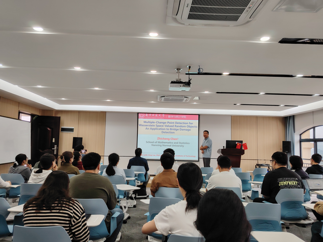 4月8日,数学与统计学院陈智成博士在实验1-602会议室作了题为“Wasserstein空间值随机对象的多变点检测及其在桥梁损伤检测中的应用”的学术报告。报告由学院副院长刘利斌主持,部分教师及全体学术型研究生参加了报告会。