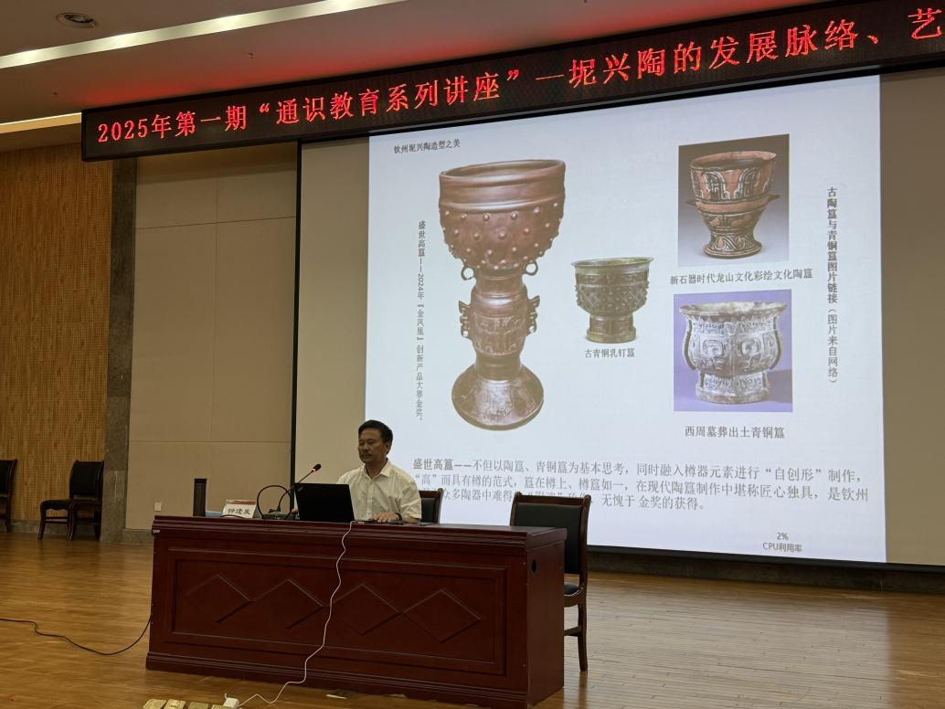为深化传统文化教育,5月6日下午,旅游与文化学院在武鸣校区图书馆报告厅顺利承办南宁师范大学2025年首期“通识教育系列讲座”。特邀钦州坭兴陶研究院院长、学校优秀校友钟逢发担任主讲,以“坭兴陶的发展脉络、艺术特质与审美哲学”为题,带领学子探寻国家级非遗的文化密码。讲座由旅游与文化学院党委副书记黄珍主持,广西神岫陶艺有限公司总经理周建裕,学校共计400多名师生参加。