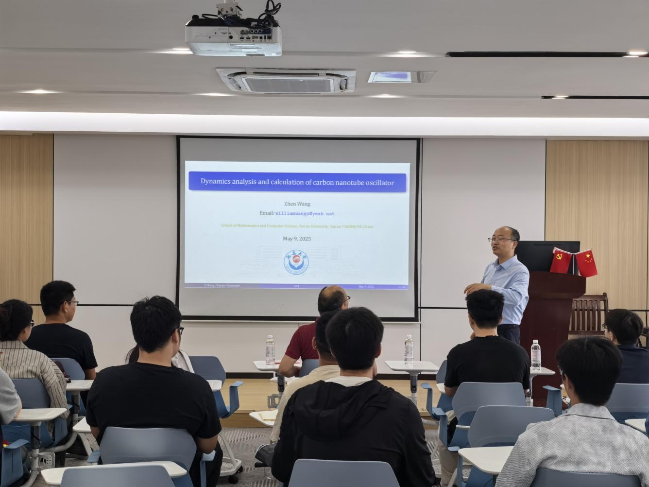 5月9日,应广西应用数学中心(南宁师范大学)的邀请,延安大学王震教授为数学与统计学院的师生作了《Dynamic analysis and caculation of carbon nanotube oscillator》的学术报告,报告由中心主任黄在堂主持。