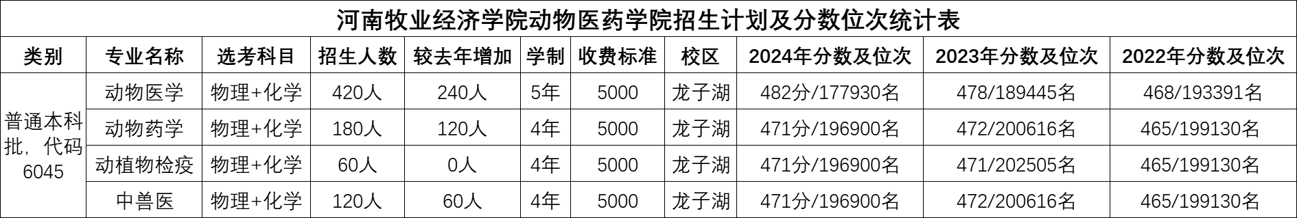 河南牧业经济学院动物医药学院招生计划及分数位次统计表